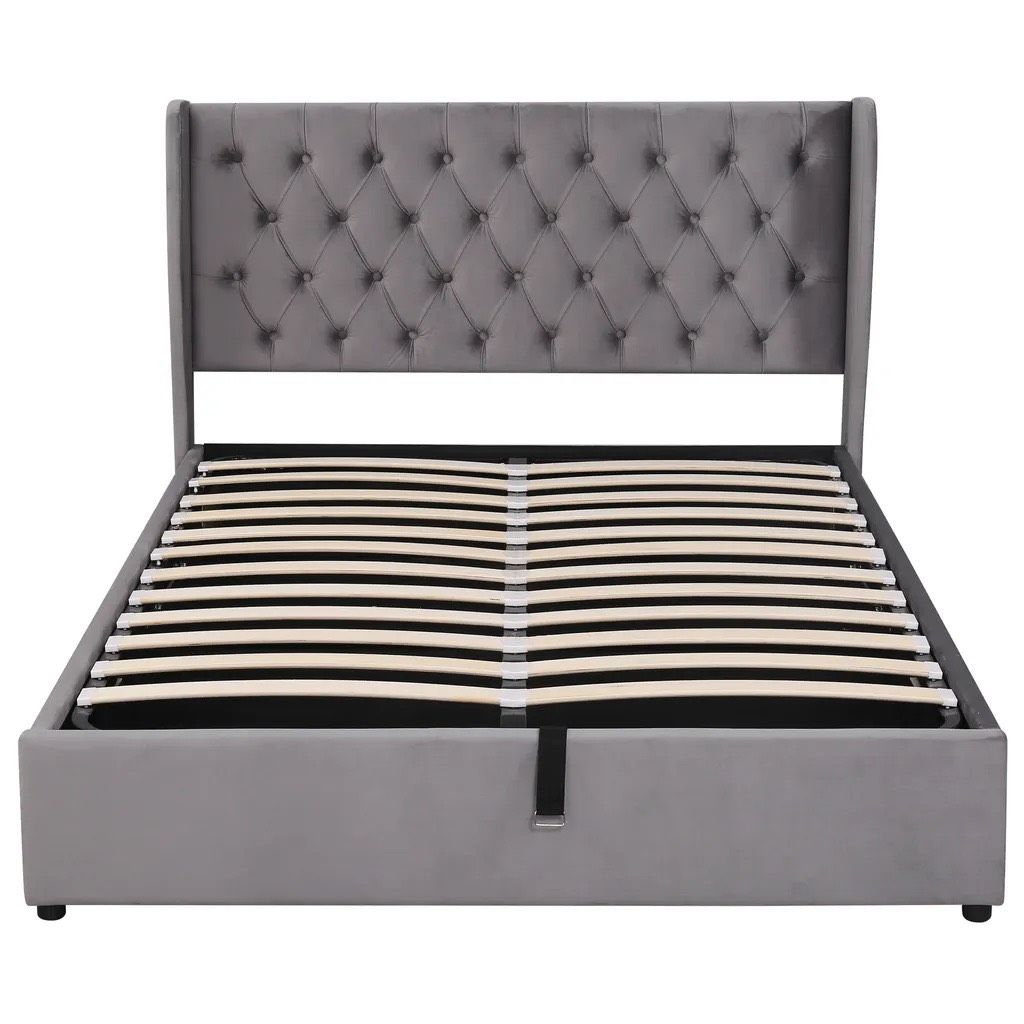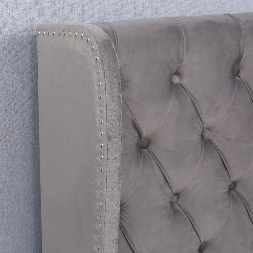 Bu döşemeli yatak, zarafet için çıtçıtlı klasik kapitone bir yatak başlığına sahiptir.